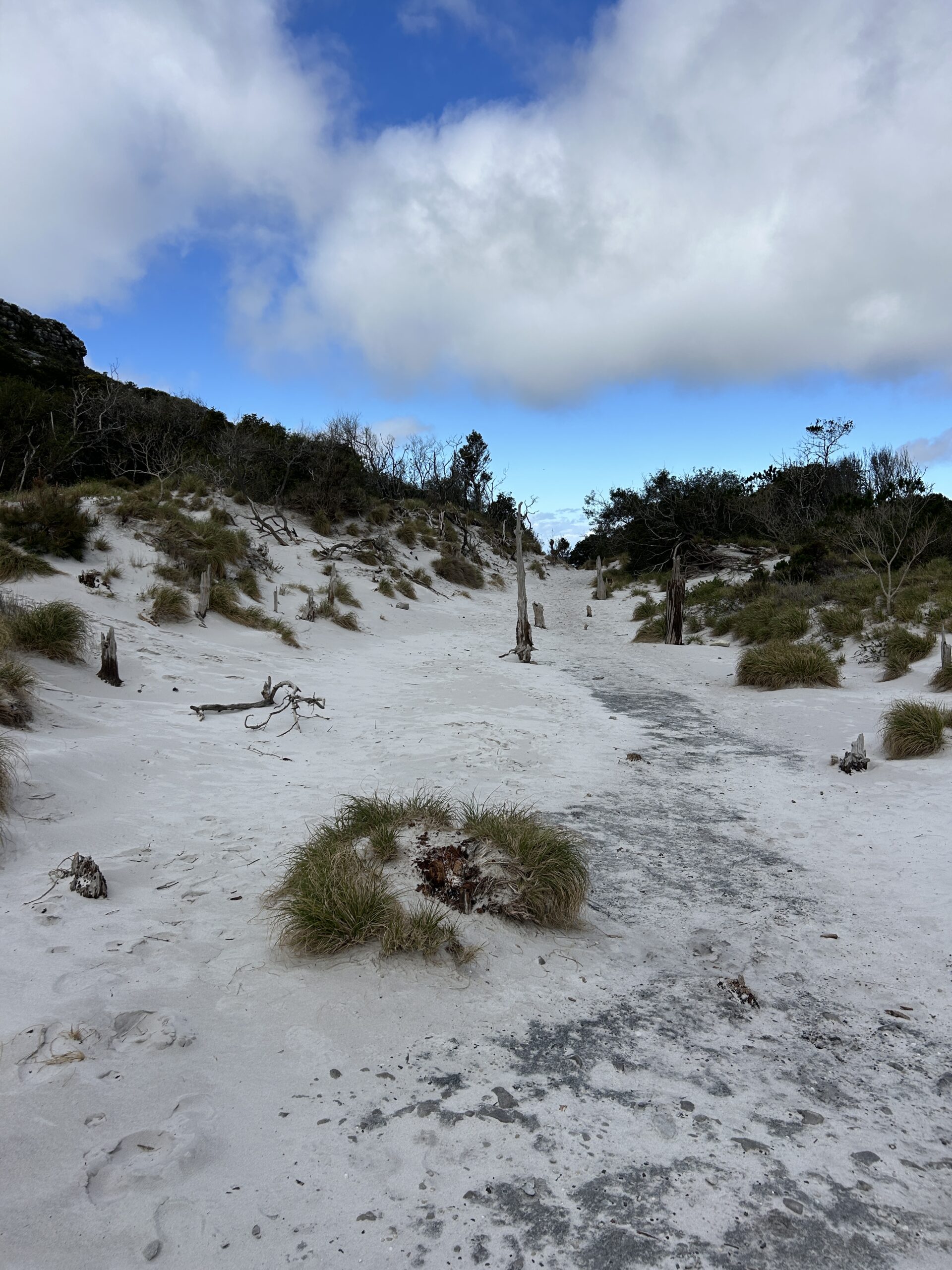 Ce sable s’accumule en certains endroits, parfois au bord des réservoirs, donnant vraiment l’impression de plages miniatures perchées à plus de 1 000 m d’altitude. En marchant près du Hely-Hutchinson Reservoir, on a souvent cette impression étrange de se retrouver sur une plage en plein ciel, avec l’eau bleutée d’un lac et du sable blanc pur — un contraste saisissant avec la végétation fynbos alentour.